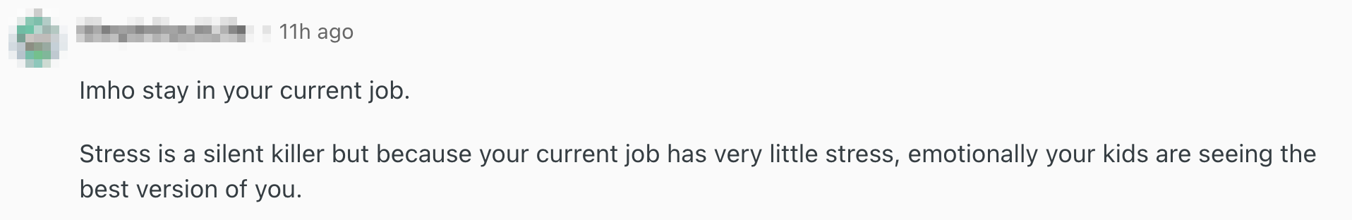 Many Reddit users advised the OP to stay in their current, low-stress role, given the financial responsibilities and family commitments.