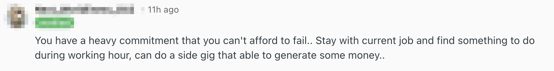 Another commenter highlighted the OP’s heavy financial commitments, cautioning that they may not be in a position to take risks.