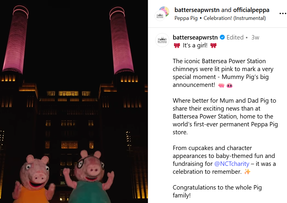 Gender reveal for Peppa Pig’s new sibling lit up Battersea Power Station