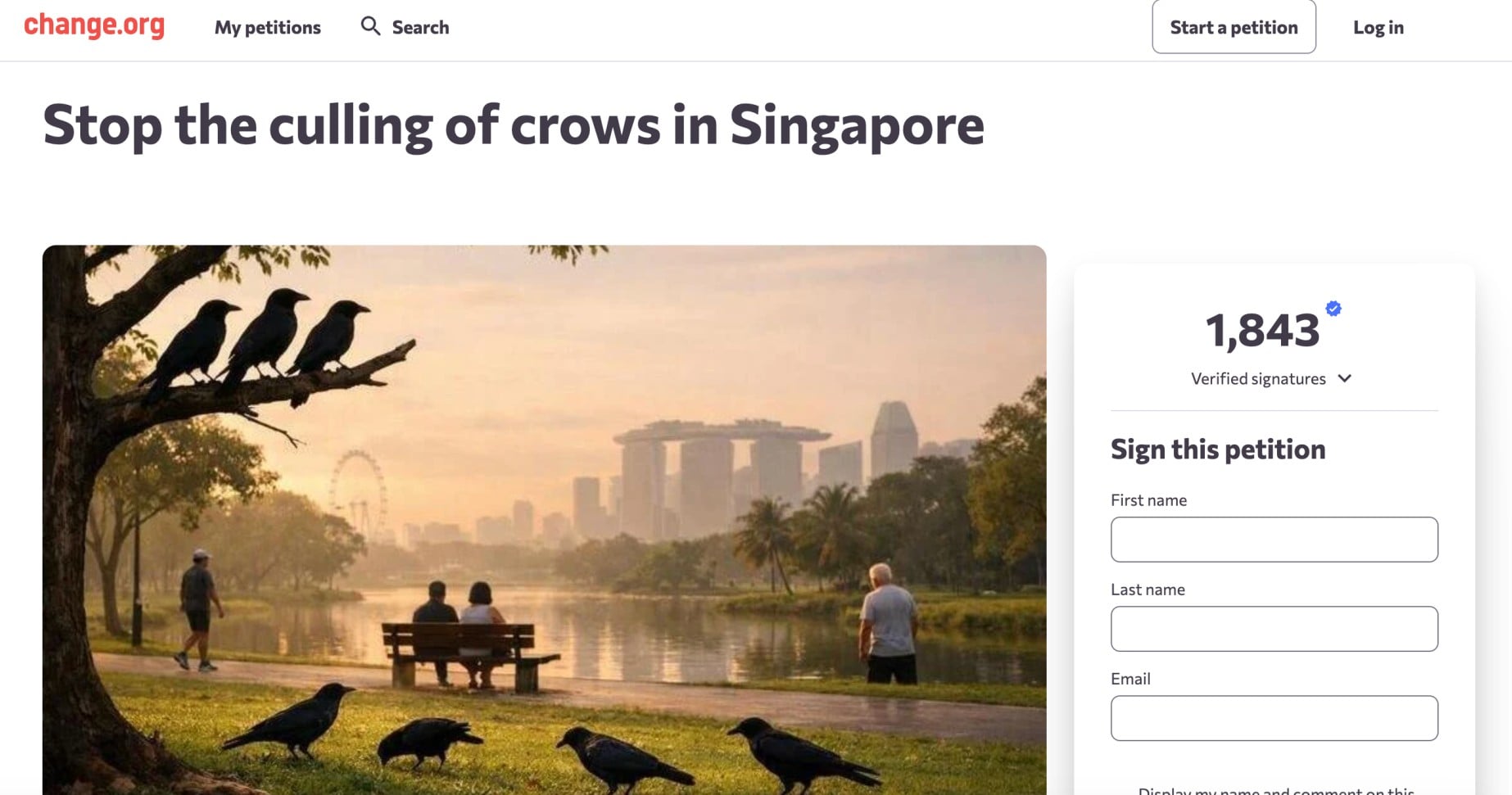 The petition, titled “Stop the culling of crows in Singapore”, was posted on 4 April and urges a shift towards more humane wildlife management practices.