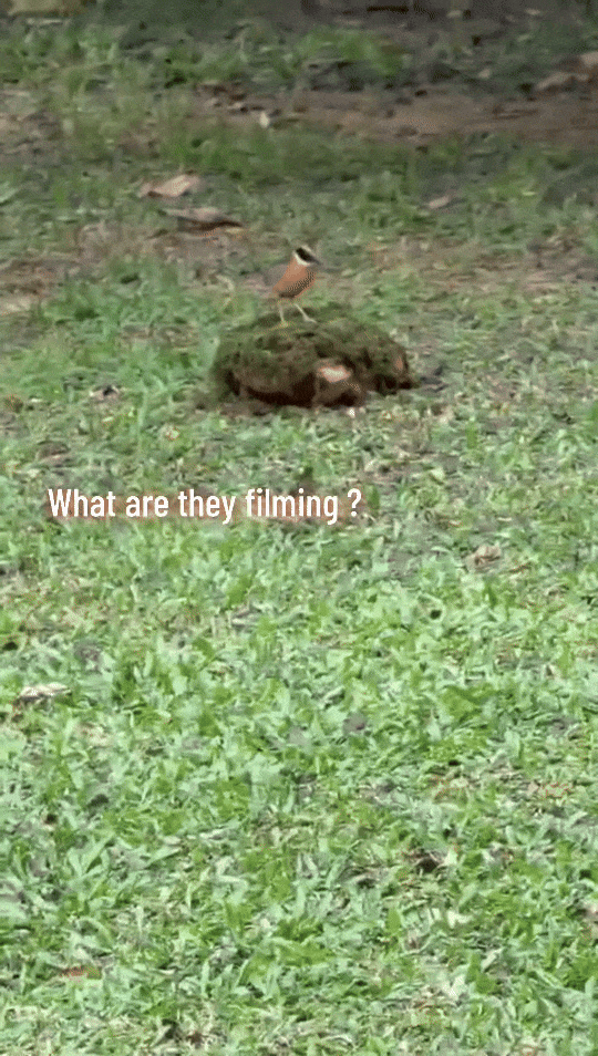 The camera then pans to reveal the centre of attention: a small bird perched quietly in the middle of the grass patch.