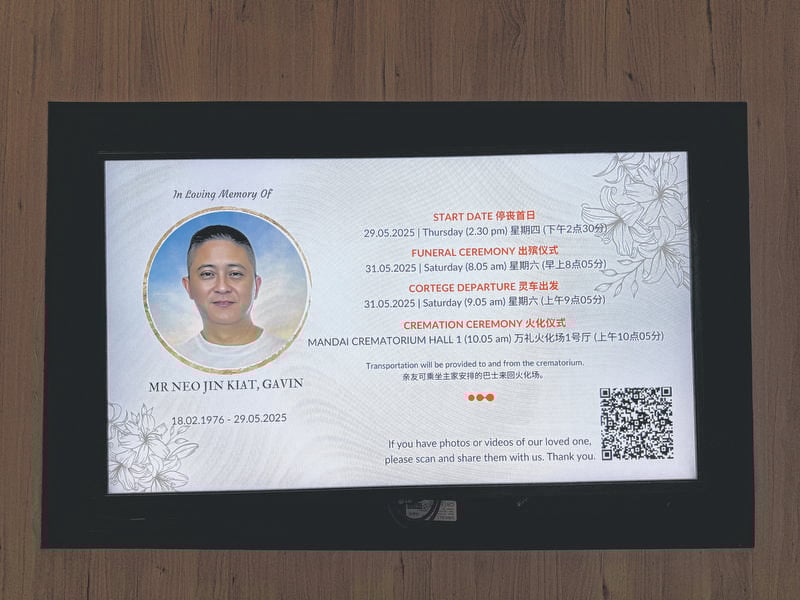 According to the obituary attached, Mr Neo died on Thursday (29 May) and was cremated on Saturday (31 May) after a two-day wake.