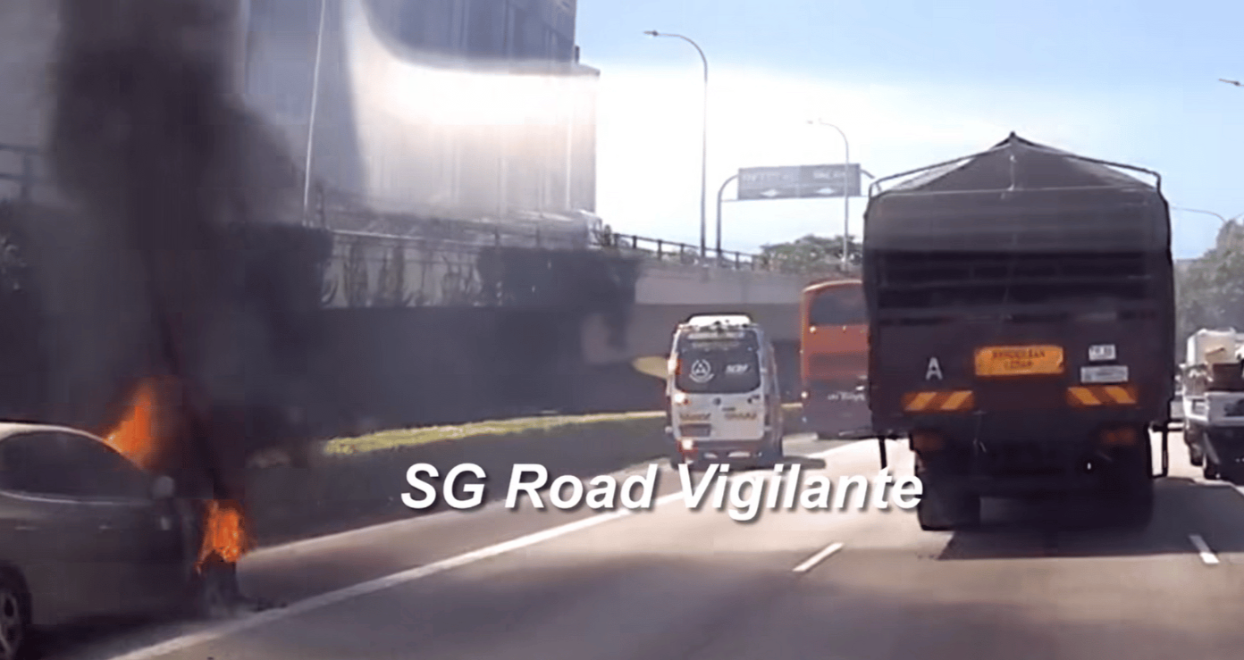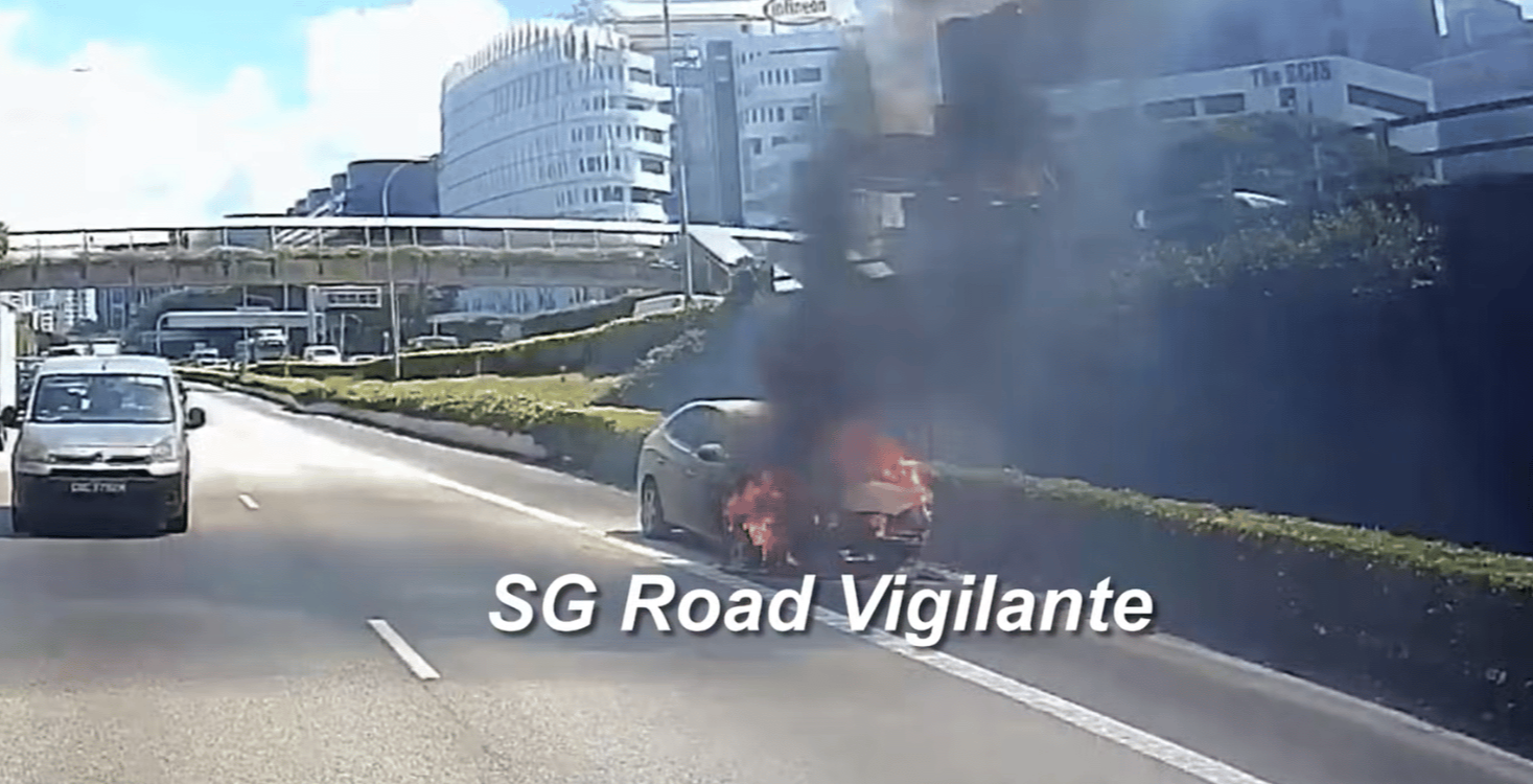 Another dashcam footage posted on the Singapore Road Vigilante Facebook page showed the car’s front bonnet up in flames.