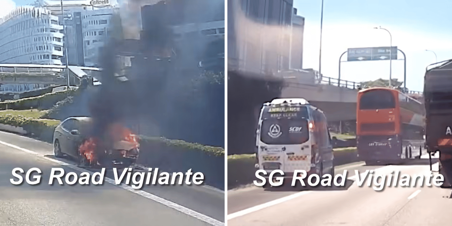 Another dashcam footage posted on the Singapore Road Vigilante Facebook page showed the car’s front bonnet up in flames.