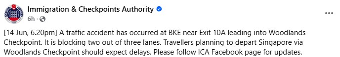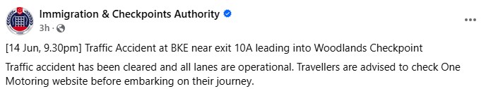 In a Facebook post at 6.20pm on Saturday, the Immigration & Checkpoints Authority (ICA) said an accident had occurred at the BKE near Exit 10A leading into Woodlands Checkpoint.