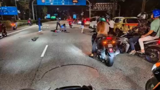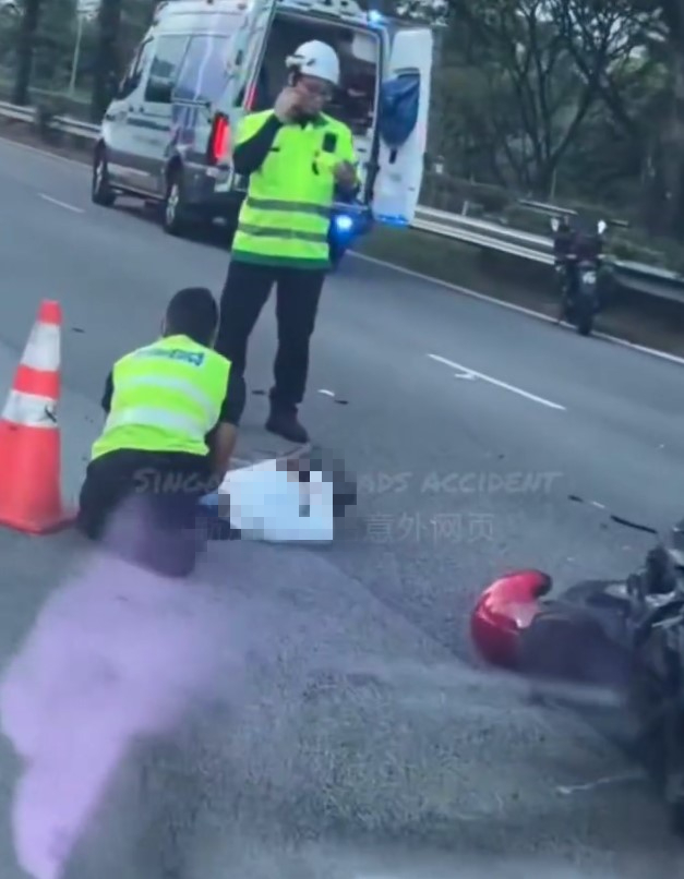 In the clip, which had a timestamp of 6.19pm on Saturday (14 June), a wrecked motorcycle could be seen in the middle lane, with paramedics attending to a person lying on the road.