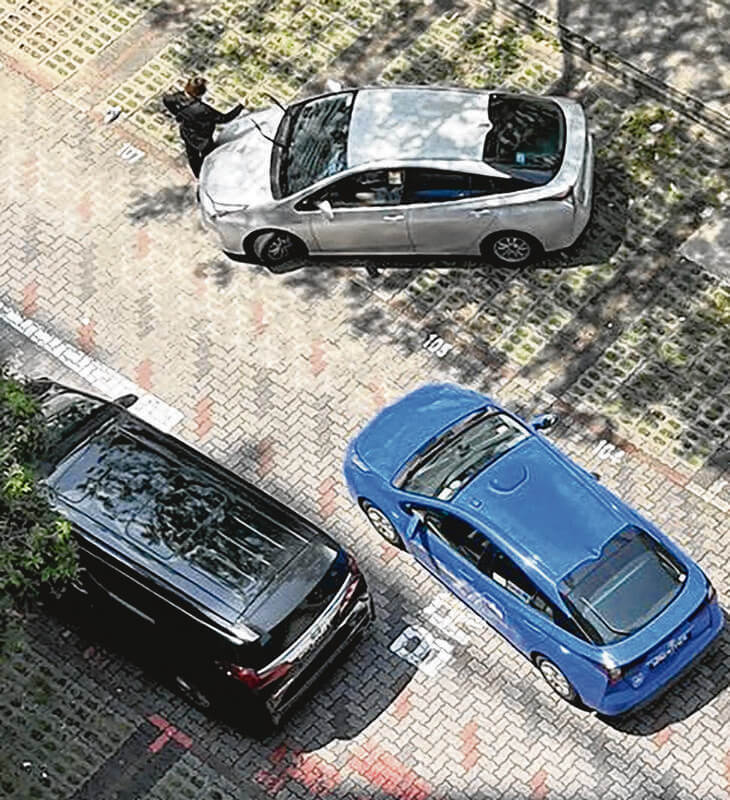 The video also shows the black SUV stopped in the middle of the driveway and the silver car parked sideways in a lot, effectively blocking the path of a blue taxi trying to exit the carpark.