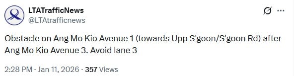In a post on X made at 2.28pm, the Land Transport Authority (LTA) said there was an “obstacle” on Ang Mo Kio Avenue 1 in the direction of Upper Serangoon, after Ang Mo Kio Avenue 3.
