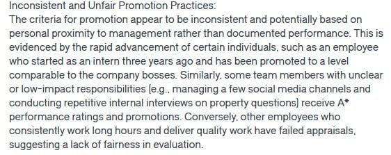 The reviewer said promotion was potentially based on “personal proximity to management rather than documented performance”.