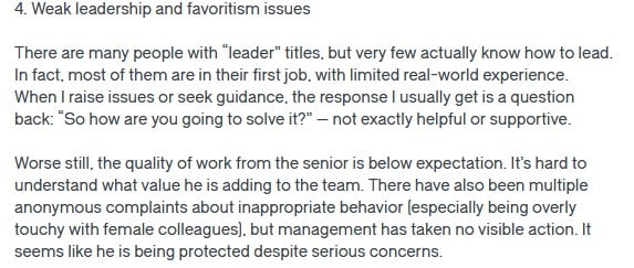 “This is evidenced by the rapid advancement of certain individuals, such as an employee who started as an intern three years ago and has been promoted to a level comparable to the company bosses,” alleged the reviewer.
