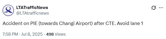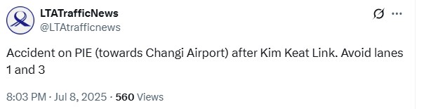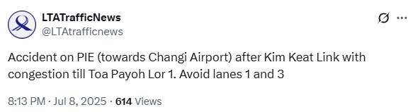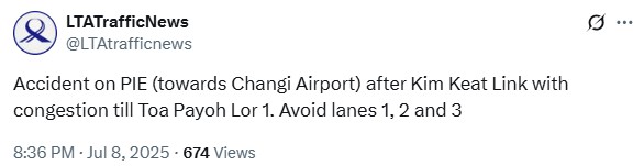 The Land Transport Authority (LTA), posting on its traffic news account on X, said at 7.58pm that an accident had occurred on the PIE in the direction of Changi, and advised motorists to avoid lane 1.