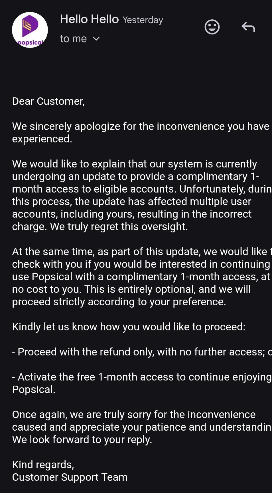 It added that the company regretted the oversight and offered two options: proceed with a refund only, with “no further access”, or activate the complimentary one-month access to “continue enjoying Popsical”.