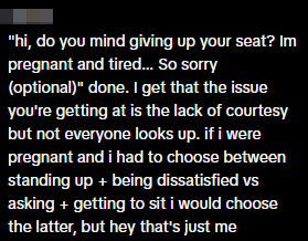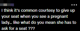 Others sympathised with the pregnant woman, arguing that offering a seat to a pregnant woman should be a given.