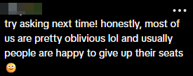 Another TikTok user said that “people are happy to give up their seats”, urging the OP to just try asking next time.