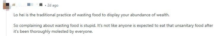 Another user claimed that the purpose of lo hei was to waste food to display abundance. Thus, it was “stupid” to complain about wasting food.