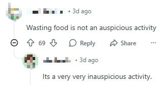 Many also criticised them for “wasting food”, pointing out that this was not auspicious.