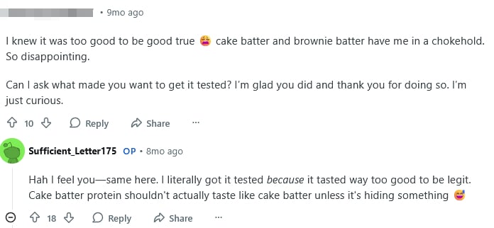“Cake batter protein shouldn’t actually taste like cake batter unless it’s hiding something,” they added.