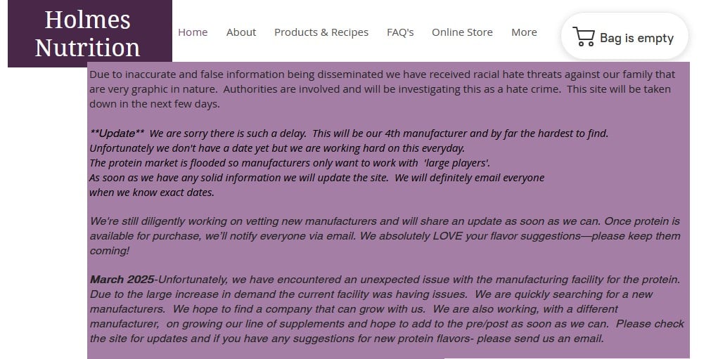 Sometime in March 2025, Holmes Nutrition removed all protein powders from its online store.
