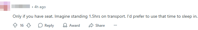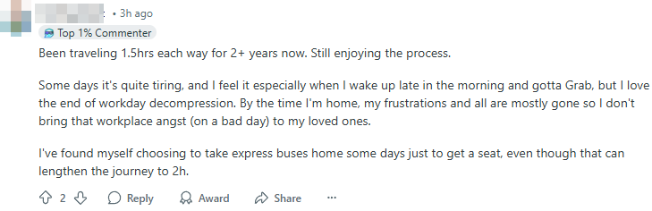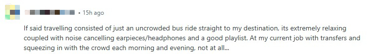 A few Redditors summed up the debate succinctly by saying that a public transport commute can be relaxing if the circumstances are right — i.e. no crowds and perhaps a pair of earphones and music.