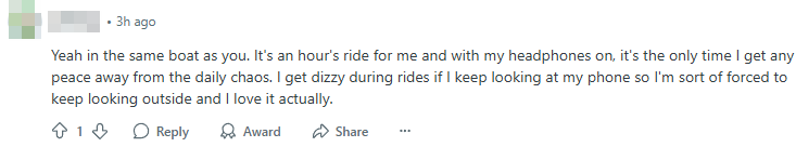 The thread, titled “Does anyone else secretly love the travel to/from work/school?”, has already garnered more than 70 comments as users shared their opinions.