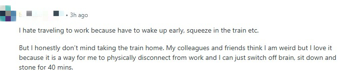 Another user agreed, calling their hour-long commute “peace away from the daily chaos”.
