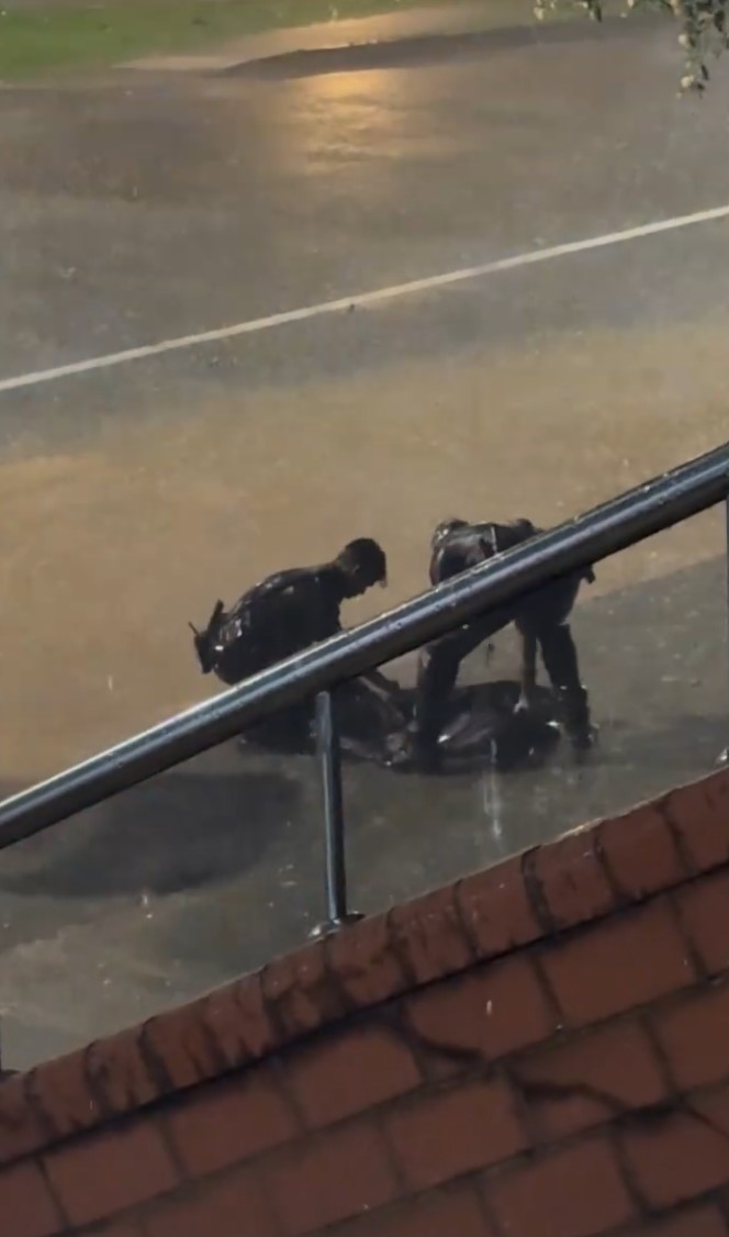 The officers pitched a blue police tent over the bag as rain started pouring from the sky. They worked diligently in the rain to secure it before parking three cars to cordon off entry to the road.
