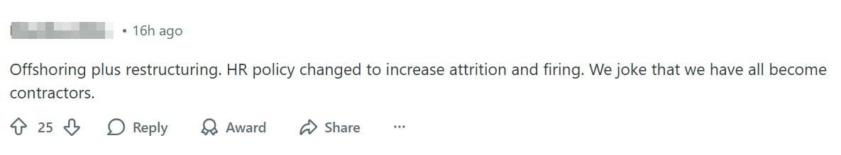 Another Redditor also cited offshoring and restructuring as contributing factors for the shift in HR policy.