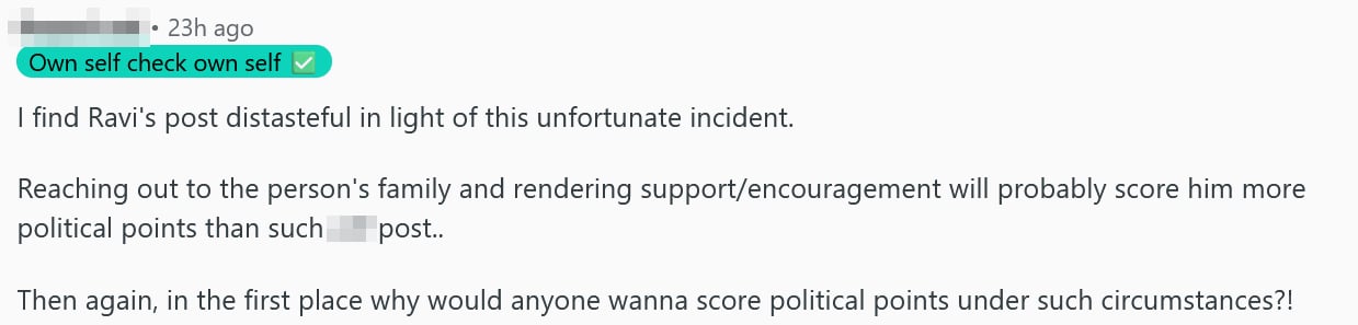 A Reddit user called his post “distasteful” and intended to “score political points”, saying Mr Philemon should have reached out to the deceased’s family to offer support instead.