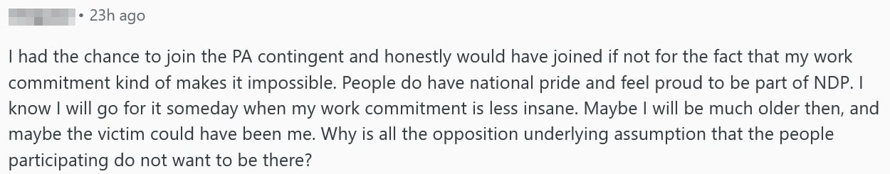 “People do have national pride and feel proud to be part of NDP,” another commenter said, questioning why some people assumed the participants didn’t want to be there.