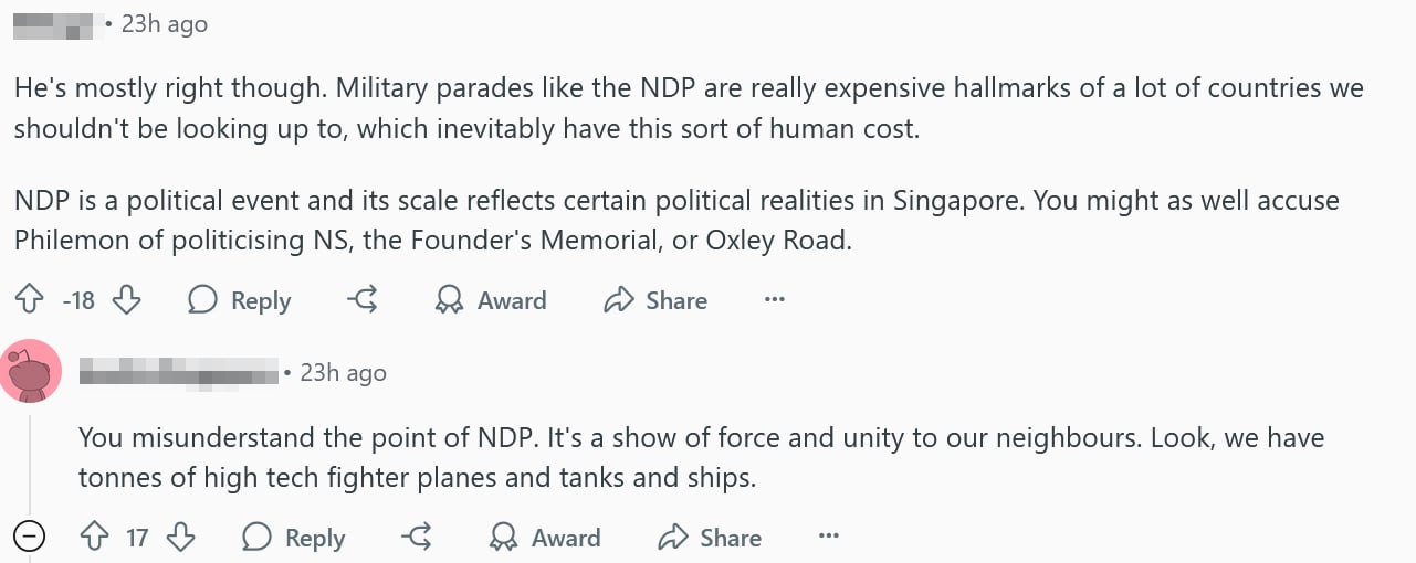 A few netizens expressed agreement with Mr Philemon’s take, calling NDP a political event with a human cost.