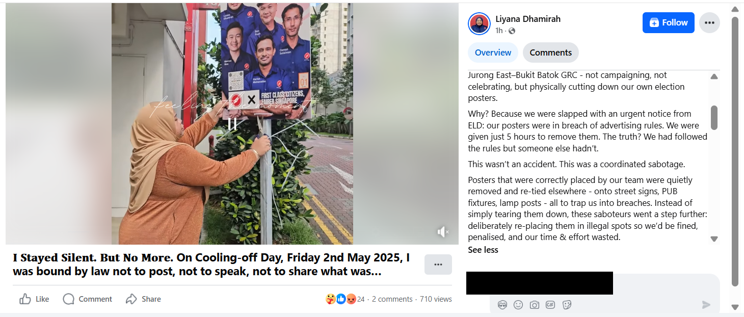 In a strongly worded Facebook post published on 9 May, the candidate for Jurong East–Bukit Batok GRC revealed that she spent Cooling-Off Day — when campaigning and fresh election advertising is banned — removing up to 30 campaign posters across the constituency.
