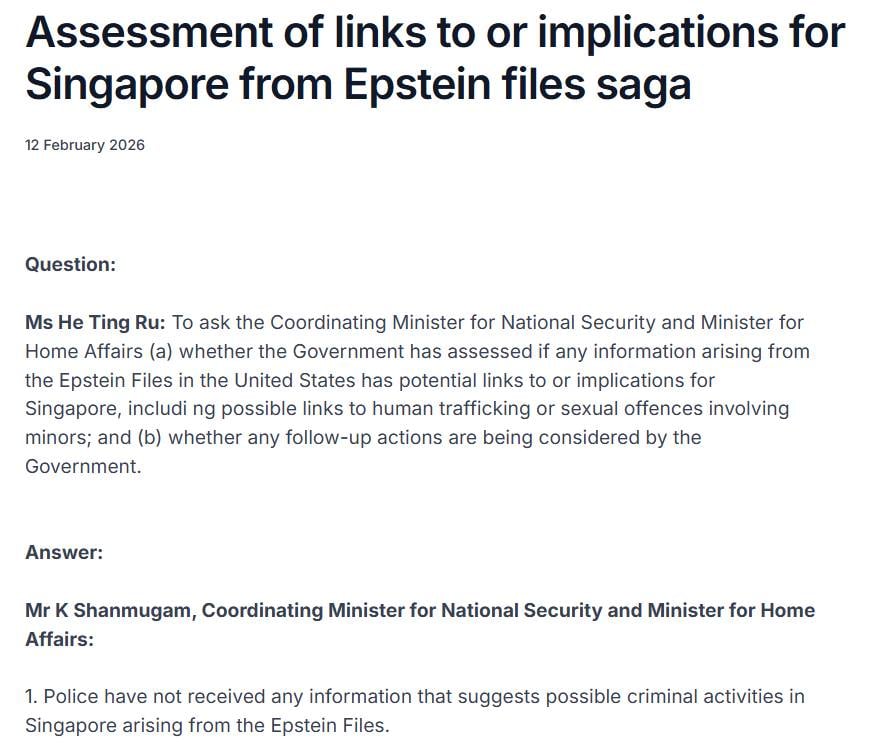 Ms He asked whether the Government had assessed if information arising from the Epstein Files in the United States had potential links to or implications for Singapore, including possible links to human trafficking or sexual offences involving minors.