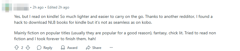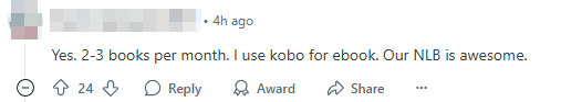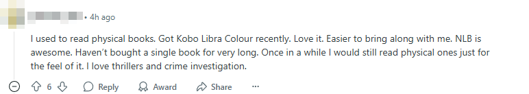 “Our NLB is awesome,” one user wrote, adding that they read two to three books a month using a Kobo e-reader.