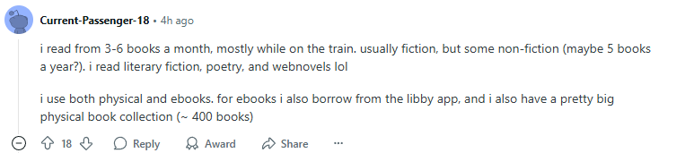 Another Redditor shared that they mostly read during commutes, juggling both physical books and e-books borrowed via Libby.