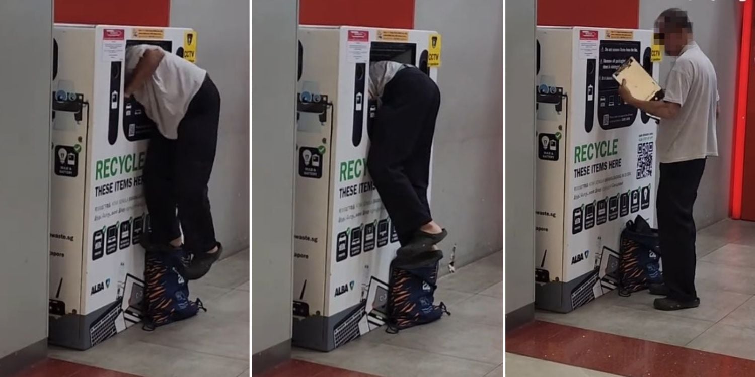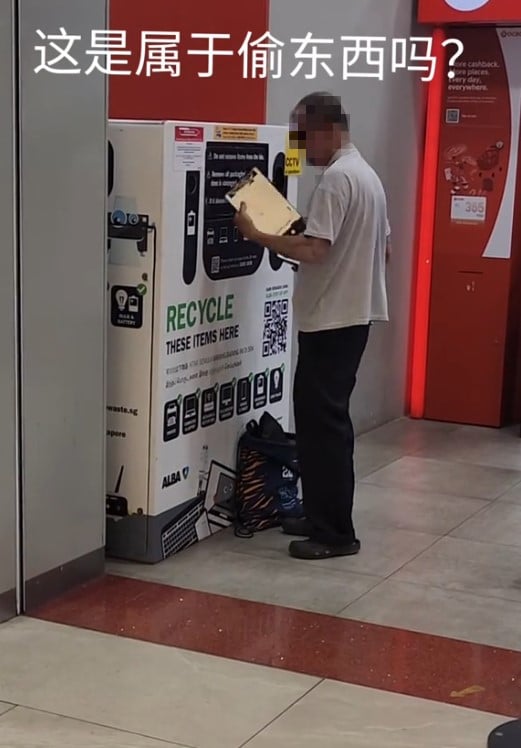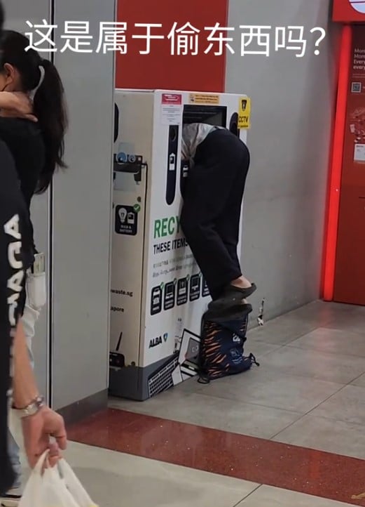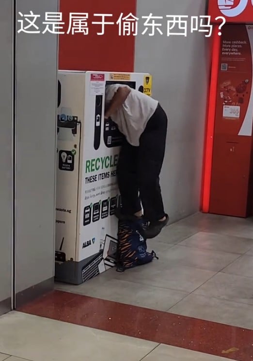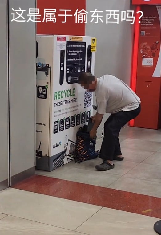 A man was seen brazenly diving into an e-waste bin at AMK Hub in Ang Mo Kio and emerging with a device, presumably from inside the bin.
