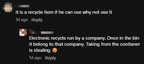 In the comments, some netizens did not think it was a big deal, but others explained that it was stealing, as the item belonged to the company that runs the bin.
