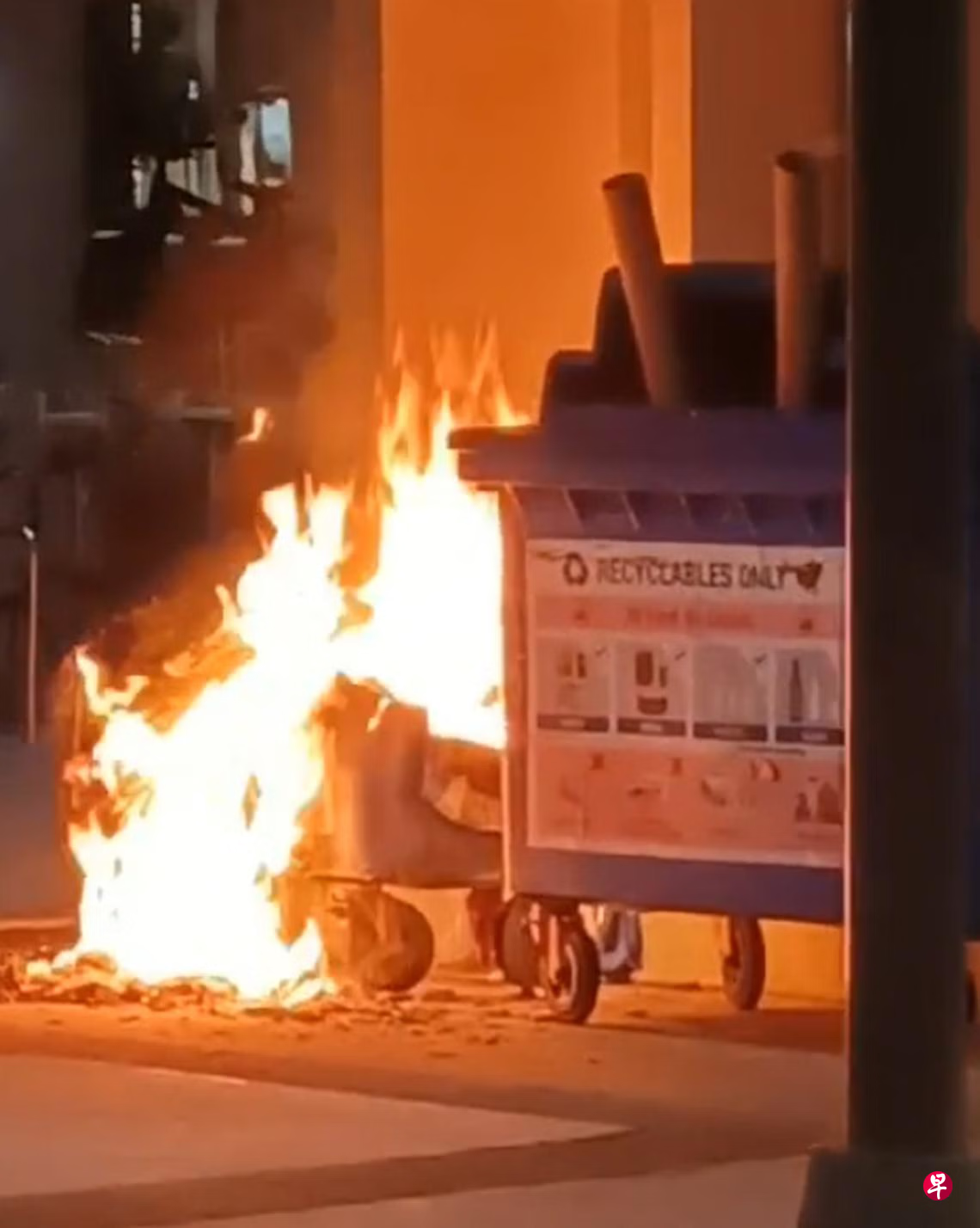 The next day, a recycling bin on the ground floor of the same block went up in flames, prompting members of the public to douse the fire using buckets of water.