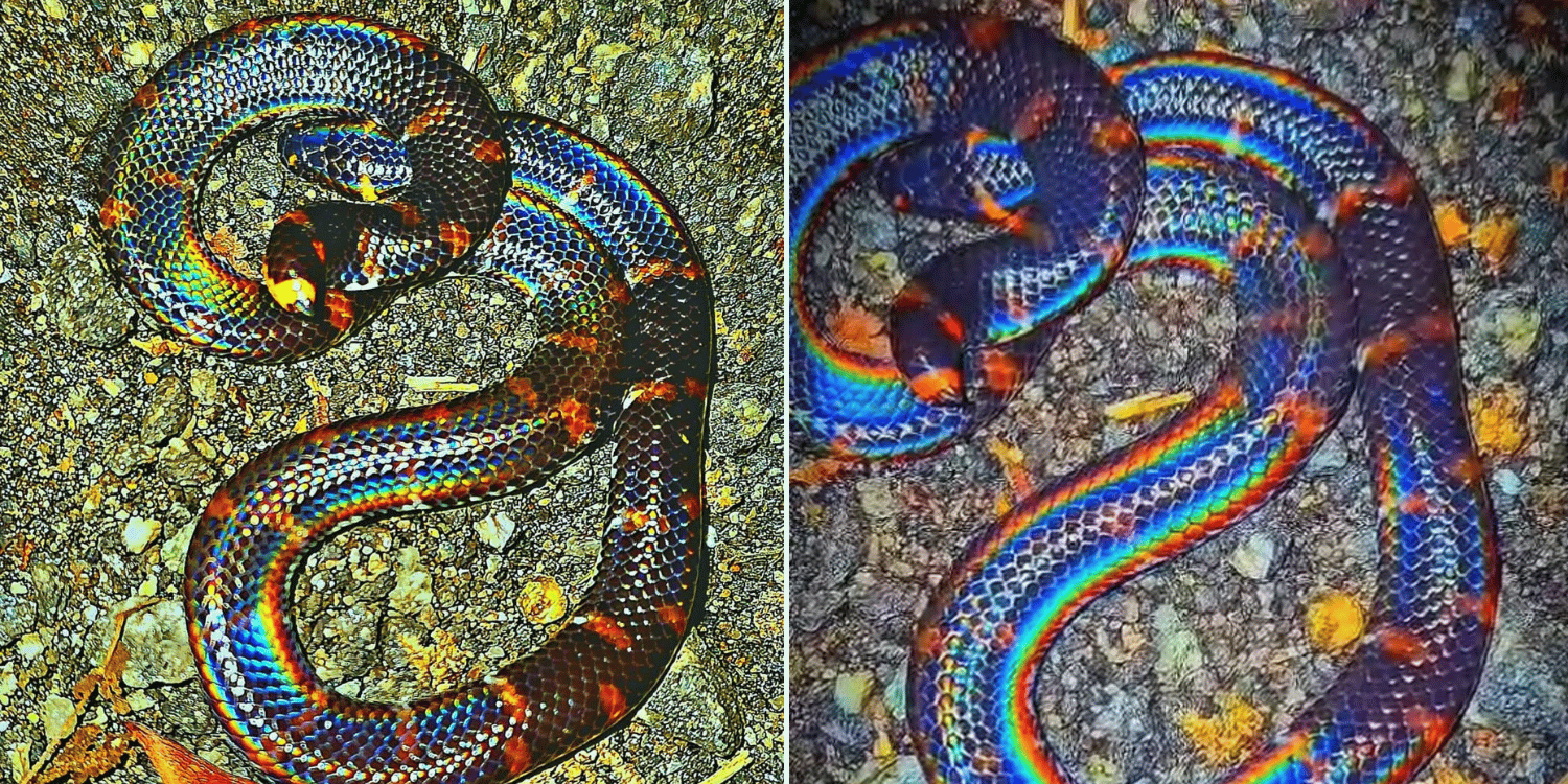 But when he came nearer, the ‘stick’ began to reveal brilliant colours, its scales glowing with a rainbow-like iridescence.