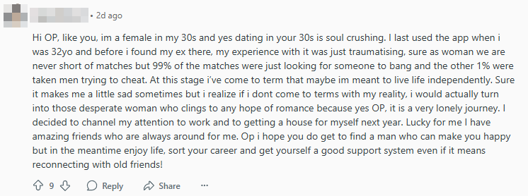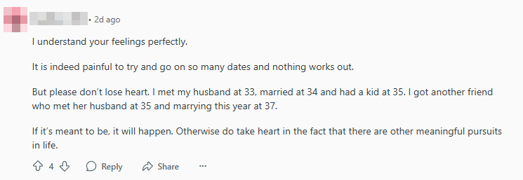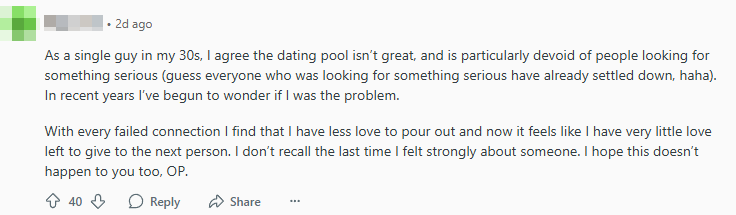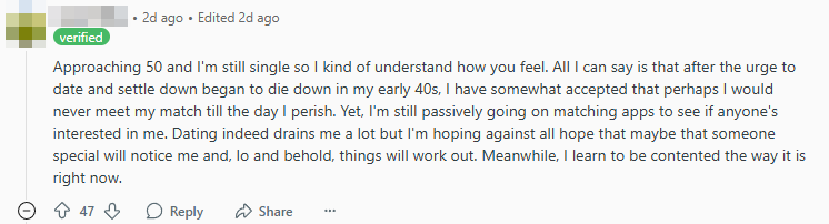 That’s what one Redditor candidly revealed in a now-viral post titled “Dating in your 30s in Singapore is quietly heartbreaking”.