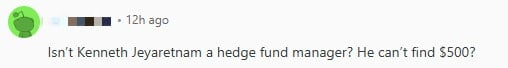A user wondered why Mr Jeyaretnam did not have S$500, considering he is a hedge fund manager.