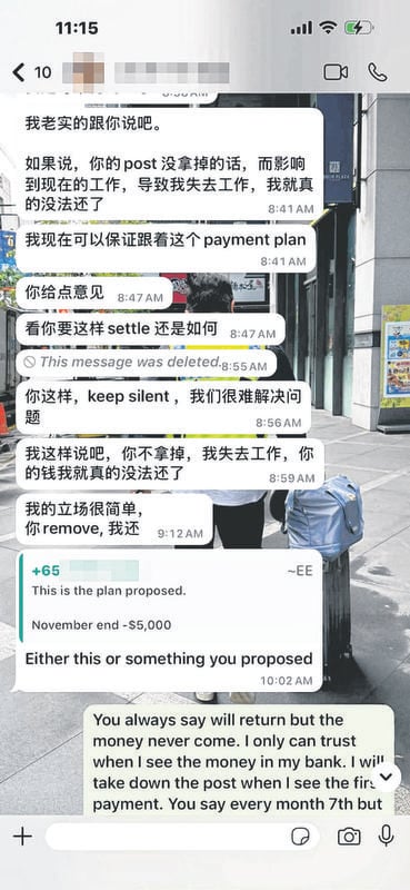 The designer urged her to remove the social media post, claiming it would affect his work and delay repayment.