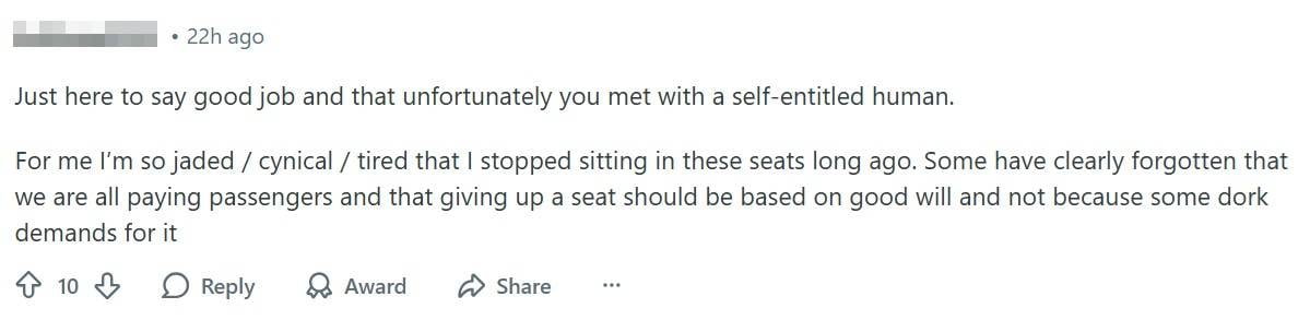 A commenter shared that they stopped sitting on reserved seats on the train a long time ago due to being “jaded”.