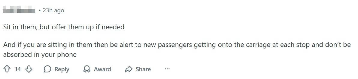 Another Redditor said commuters should be allowed to sit on reserved seats, as long as they are prepared to give them up to those who need them more.