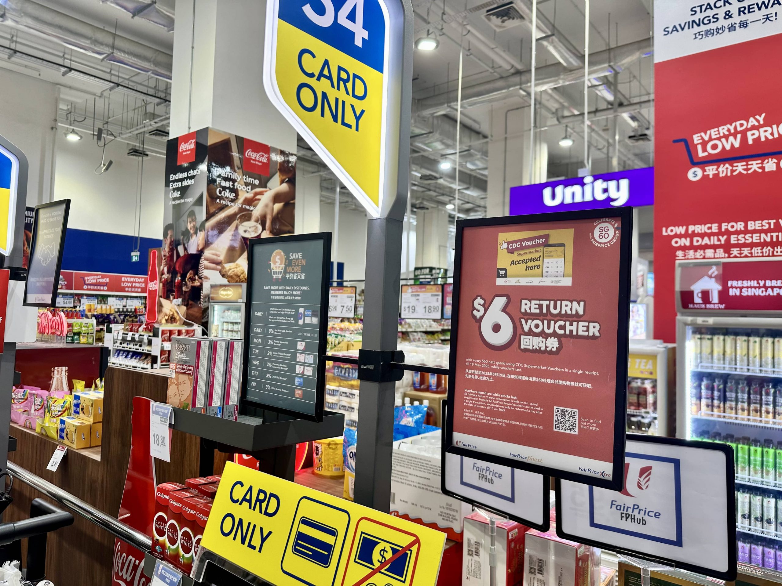 FairPrice is giving away S$6 return vouchers for every S$60 Community Development Council (CDC) supermarket voucher spent in a single transaction at FairPrice outlets.