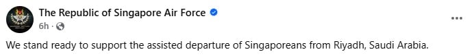 In a Facebook post, RSAF said it stood ready to support the assisted departure of Singaporeans.