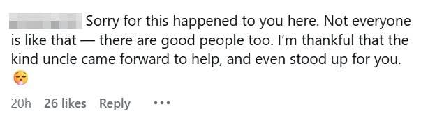 A commenter apologised to Shanice for the unpleasant experience, adding that the uncle’s actions showed there are many good people in Singapore.