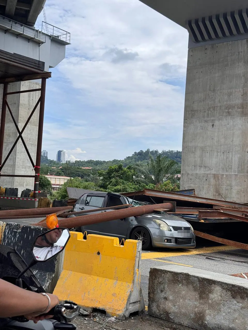 Huge construction scaffolding falls & crushes car in M’sia, driver survives unharmed