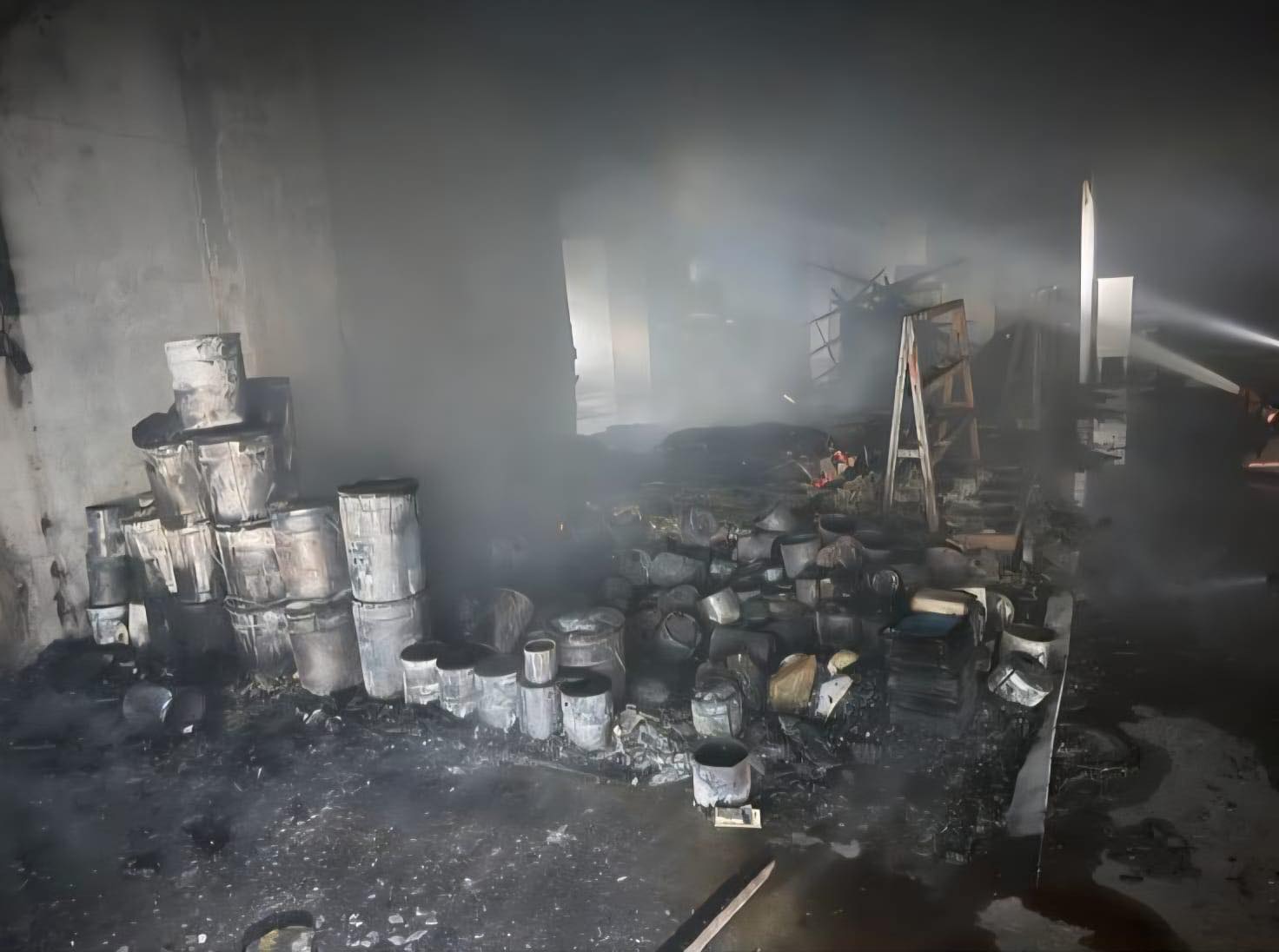 Tins of paint and wooden pallets had caught fire at a unit on the second floor of the industrial building, filling the entire floor with smoke.