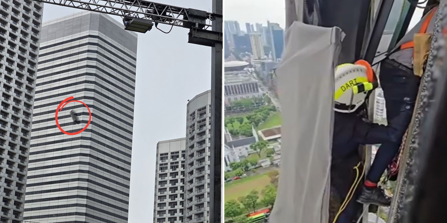 Two workers found themselves dangling inside a gondola between the 28th and 29th floors of Raffles City Tower earlier today (21 July), prompting a high-altitude rescue by the Singapore Civil Defence Force (SCDF).