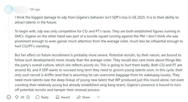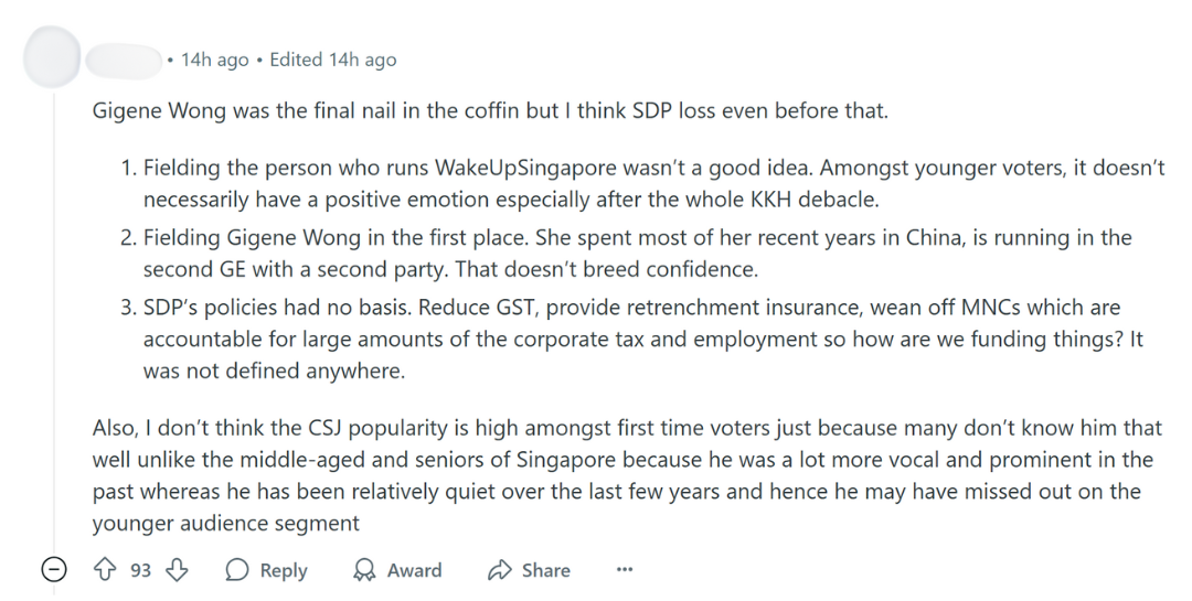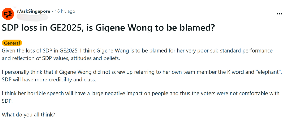 A thread titled “SDP loss in GE2025: Is Gigene Wong to be blamed?” on r/SingaporeRaw has gained significant traction, with netizens debating if Gigene Wong’s racially charged remarks during a rally played a key role in the party’s downfall.